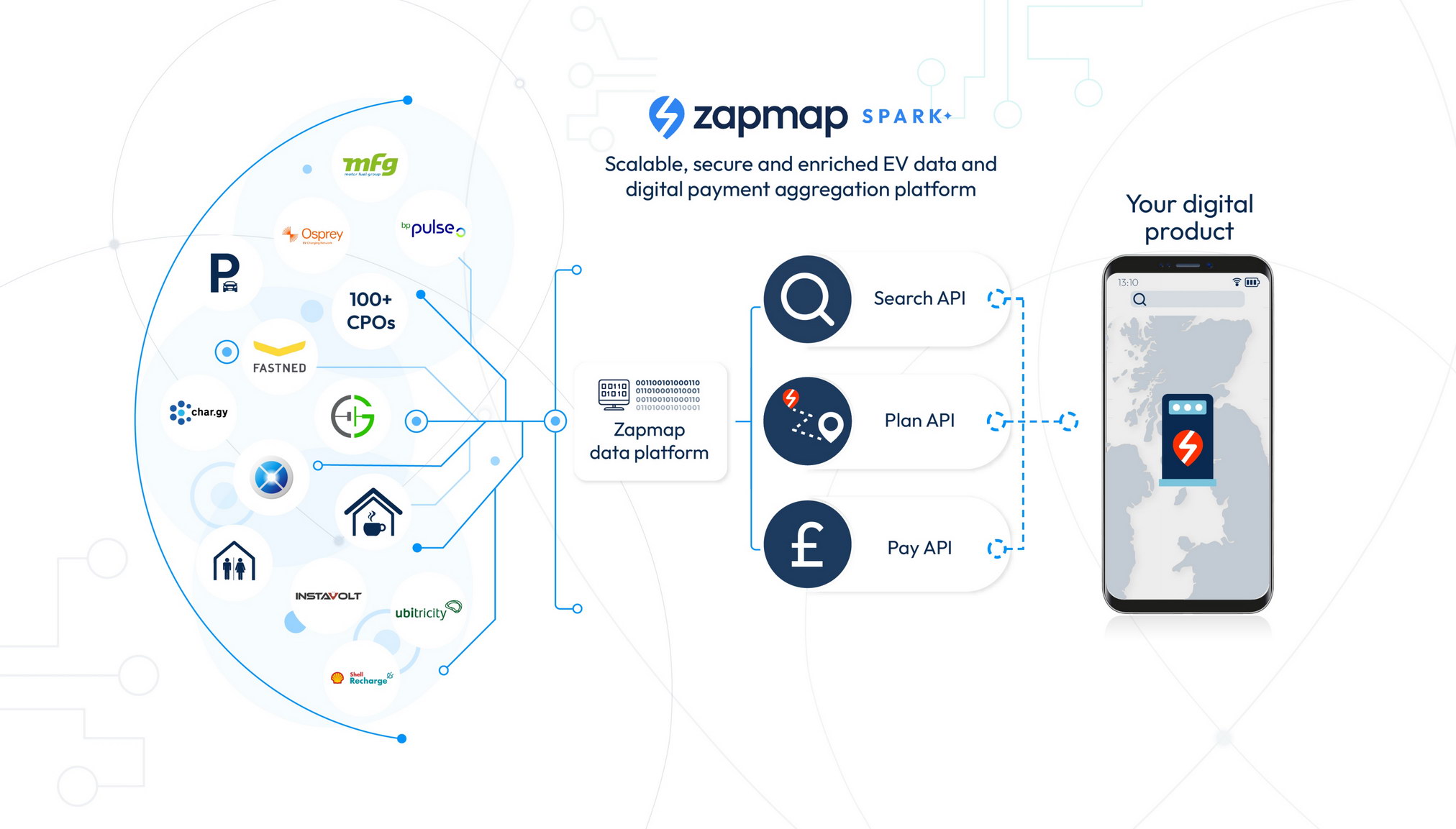 - The new product from Zapmap powers third-party digital platforms and apps with EV features through an API integration.
